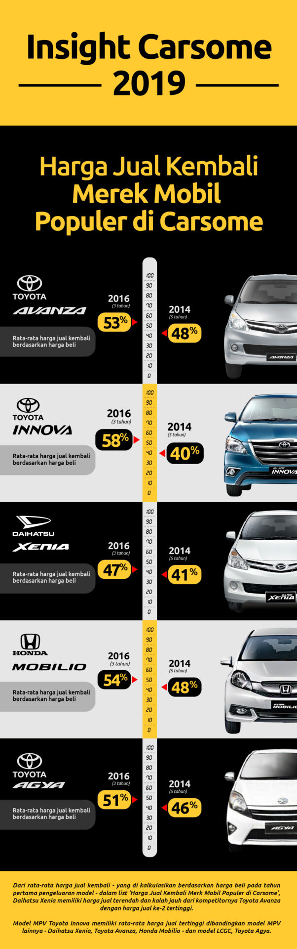 * Statistik & angka yang disajikan pada artikel dan Carsome Insights 2019 adalah perkiraan rata-rata berdasarkan data internal mobil Carsome yang digunakan. Harga kendaraan dan nilai jual kembali akan tergantung pada merek kendaraan, model, permintaan pasar, kondisi, dan faktor lain yang berlaku.